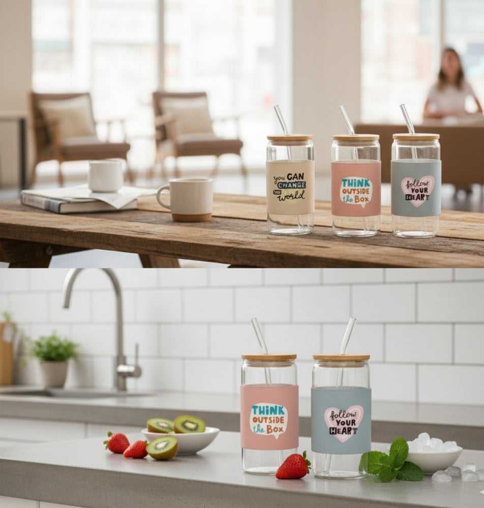 motivational glass tumblers with bamboo lids and reusable straws.